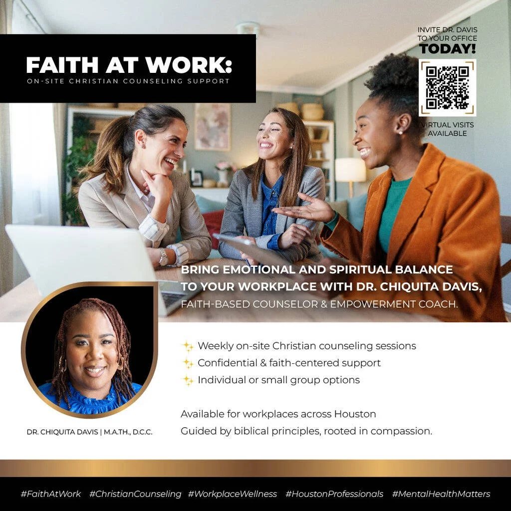 This service offers on-site and virtual Christian counseling support to help you strengthen your spiritual foundation, navigate workplace challenges with grace, and maintain emotional and mental wellbeing while pursuing your purpose.